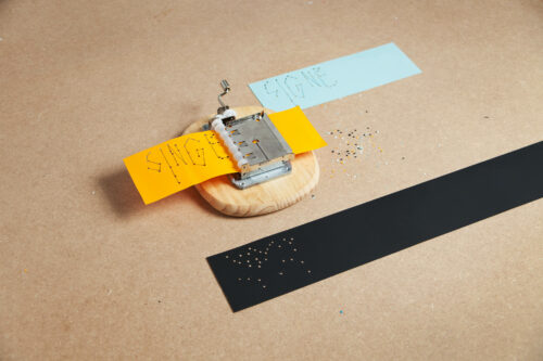 Ce dispositif détourne l’utilisation du componium : instrument de musique mécanique qui joue les notes à partir de cartes perforées. Ici, les mélodies ne sont pas harmonieuses au sens musical mais typographiques : on compose la musique en écrivant des mots.